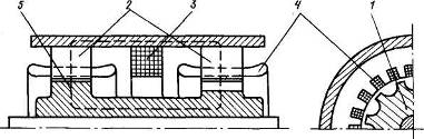 У більшості типів електричних машин магнітне поле створюється змінними струмами обмоток статора й ротора. Однак існує клас машин, у яких поле створюється постійними струмами обмоток, розташованих тільки на статорі. Перетворення енергії в них відбувається за рахунок зміни магнітного потоку в повітряному зазорі через зміну його провідності при обертанні ротора. Ротор у таких машинах має яскраво виражені зубці, переміщення яких щодо статора викликає зміна магнітного опору на ділянках зазору й обмотки статора. Такі машини називають параметричними або індукторними. Конструктивні виконання індукторних машин досить різноманітні. Найбільше поширення одержала конструкція індукторної машини із двома роторами 1 і статорами 2 (мал. 4). Якщо ротори зрушені відносно один одного на електричний кут 90°, загальний магнітний опір машини під час обертання роторів не змінюється й в обмотці збудження 3, що харчується постійним струмом, не наводиться змінна напруги. Обмотки на роторах відсутні. При роботі машини з обмоток змінного струму 4, розташованих у пазах кожного статора, знімається напруга. Потік порушення замикається по корпусі статора й втулці ротора 5, насадженої на вал.