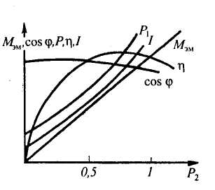U-Образні характеристики синхронних двигунів мають той же вид, що й для генераторів. При перепорушенні синхронний двигун стосовно мережі є ємністю, недозбуджений двигун споживає з мережі реактивну потужність, будучи стосовно мережі індуктивністю. При недопорушенні реакція якоря в синхронному двигуні - подмагнічує при перепорушенні - що розмагнічує. Важливе значення для дослідження процесів перетворення енергії в синхронних двигунах мають робочі характеристики (мал. 7).