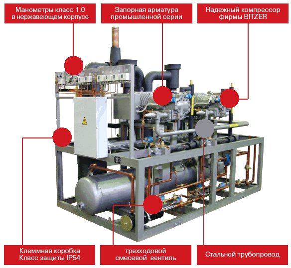 Использование в конструкции кожухотрубного конденсатора обеспечивает простоту в обслуживании, гарантирует бесперебойную работу в условиях повышенного загрязнения и влажности.