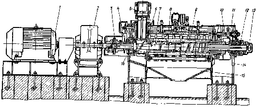 Маслосборное устройство 15 состоит из сливного листа и сборника масла и закреплено между передней и задней стойками станины на швеллерах. Привод маслопресса состоит из электродвигателя 1 и редуктора 2, которые соединены муфтой 3. Электродвигатель трехскоростной; изменяя число его полюсов, можно получить различную скорость вращения.
