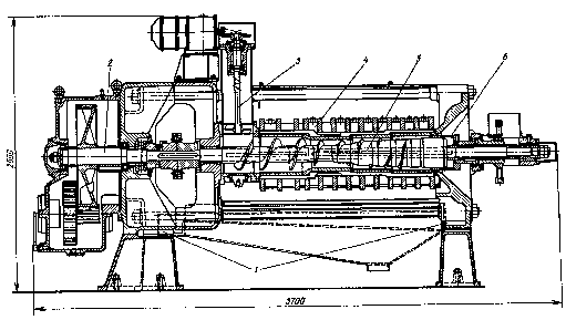 Станина 1 пресса в отличие от других типов прессов сварная. На задней стойке станины укреплен чугунный кожух редуктора 2. Между передней и задней стойками станины установлен зеер 3, состоящий из двух половинок. На передней стойке установлены опорный подшипник вала 4 и питатель 5.
