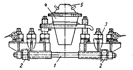 1 — стяжная штанга; 2 — стяжная гайка; 3 — зажимная гайка; 4 — термитный тигель; 5 — крышка тигля