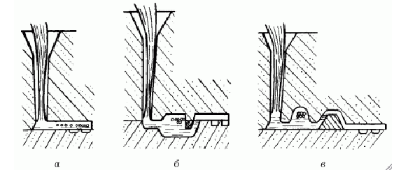 Рис. 6. Виды шлакоуловителей: а – обычный; б – с удержанием шлака в широком канале; в – с удержанием шлака в высоком канале.