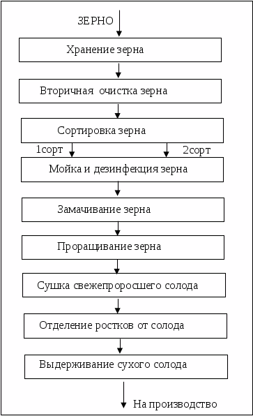 Пивоваренный завод должен иметь запас ячменя, обеспечивающий его бесперебойную работу. Ячмень, поступающий на завод, содержит различные примеси и в таком виде непригоден для дальнейшего использования. Поэтому при приёмке его подвергают очистке. После этого зерно поступает на хранение, где находится до начала переработки. Перед замачиванием зерно подвергают вторичной, более тщательной, очистке. При этом из зерновой массы удаляются оставшиеся посторонние примеси и битое зерно. После вторичной очистки зерно разделяют по размеру на 1, 2 и 3 сорта. Это необходимо для более равномерного проращивания зерна.