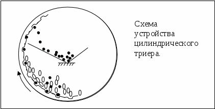 Для отделения примесей, отличающихся от целых зерен своей длиной, используют триеры. Рабочим органом в триере является цилиндр с ячейками, выбирающими короткие частицы. Цилиндр триера вращается, короткие зерна и примеси попадают в ячейки, и поднимаясь выше, чем целое зерно, отделяются от целых зёрен. Поднимаясь далее, примеси выпадают в лоток. Для выделения половинчатых зерен и шаровидных примесей диаметр ячеек триера предусмотрен 6,25 –6,5 мм, а для отделения от овса и овсюга 9,5 – 10 мм.