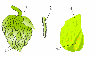 Шишка хмеля состоит из 40-70 цветков (1), расположенных на изогнутом стерженьке (2), покрытом волосками, с цветоножкой(3). Цветки представляют собой туго собранные зеленые лепестки-чешуйки(4), у основания цветков расположены золотисто желтые зернышки лупулина(5), содержащие смолистые вещества, которые придают аромат пиву. В хмелевой шишке лупулин составляет примерно 19,81%, чешуйки- 66,85%, стержень -7,36%, цветоножка -5,98%.