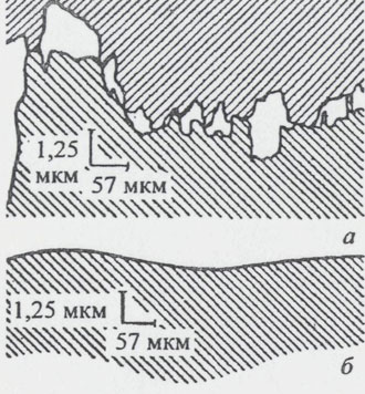 Рис.8 Профиль поверхности: а - двух собранных медных деталей перед ультразвуковой сваркой; б - нижней детали после воздействия ультразвука