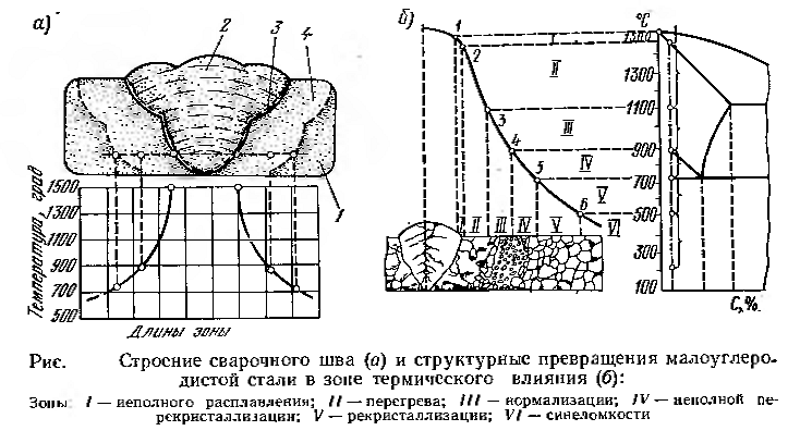 Строение сварного шва после затвердевания и распределения температуры в малоуглеродистой стали показаны на рис. 5, б. Зона I примыкает непосредственно к металлу шва. Основной металл на этом участке в процессе сварки частично расплавляется и представляет собой смесь твердой и жидкой фаз.