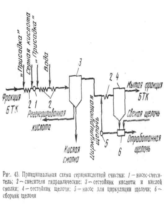 Фракція ВТК надходить у змішувач, а потім у відцентровий насос I, що є також змішувачем, сюди ж подається концентрована сірчана кислота. Тут відбувається процес алкилировапия тиофена з неграничними з'єднаннями фракції. Перед другою групою змішувачів 2 подається присадка для продовження реакції виділення тиофена. Потім суміш надходить у наступну групу змішувачів 2, куди подається вода для регенерації сірчаної кислоти, звідси суміш надходите реактор 3. В усіх попередніх апаратах сумарна тривалість контакту не перевищує звичайно 1 хв, у реакторі — 4—6 хв. Весь наступний ланцюг апаратів призначений для відстою кислоти і кислої смолки, нейтралізації фракції і відстою відпрацьованого лугу.