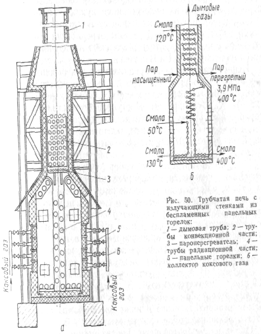 Па мал. 34 приведена схема кінцевого охолодження коксопого газу з застосуванням гарячої смоли для вимивання нафталіну з води. Верхня газова частина кінцевого холодильника обладнана полками і служить для охолодження газу. У полках мається значна кількість отворів діаметром 10 мм. Нижня частина холодильника служить промывателем і тому обладнана вісьма полками з отвором 3 мм.