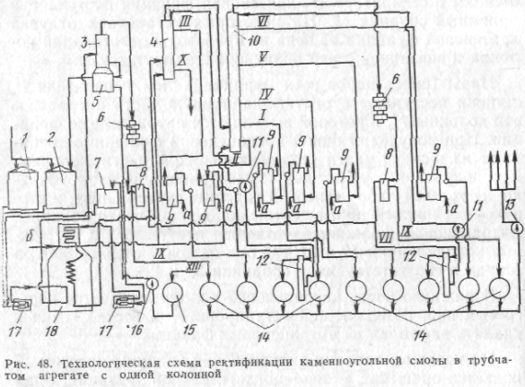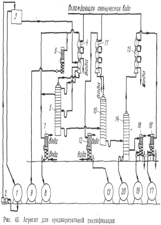 У сучасній практиці переробки сирого бензолу широке поширення одержала напівбезупинна технологічна схема Гипрококса роздільної переробки двох бензолів — першого і другого. За цією схемою передбачається безупинний добір сірковуглецевої (головний) фракції, чистих бензолу і толуолу, періодична ректифікації залишку, другого бензолу і сірковуглецевої фракції. Для здійснення цих задач цех ректифікації має у своєму розпорядженні агрегати безупинної і періодичної дії, що складаються з ректифікаційних колон і конденсациопно-охладительной апаратури, мерников і зборів-піків продуктів процесу. На мал. 45 представлена безупинна схема попередньої ректифікації. Сирий бензол зі сховища 1 подається насосом 2 у напірний бак 3. З напірного бака сирий бензол надходить насамперед у нижню трубчатку дефлегматора 4, де підігрівається за рахунок тепла конденсації пар, а потім — у середню частину бензольної колони 5. Тут глухою парою із сирого бензолу відганяються сірковуглецева і бензольна фракції. Сірковуглецева фракція, що має більш низьку температуру кипіння, проходить у виді пар дефлегматор 4 і потім конденсується в конденсаторі-холодильнику 6. Пари бензольної фракції конденсуються в дефлегматорі 4 і у виді флегми повертаються в бензольну колону на верхню тарілку, Бензольна фракція в рідкому виді відбирається з однієї з верхніх тарілок бензольної колони в комбінований конденсатор-холодильник 7 і мерник 8. Сірковуглецева фракція після конденсатора-холодильника 6 у виді готової фракції направляється в мерник 9. Дефлегматор бензольної колони складається з декількох горизонтальних трубчаток, у нижньої пари з колони додатково прохолоджуються технічною водою. Якщо з якої-небудь причини відбирати сірковуглецеву фракцію неможливо холодильник-конденсатор-холодильник цієї фракції виключають, добір рідкої бензольної фракції з колони припиняють і суміш пар цих двох фракцій направляють у конденсатор-холодильник 7 і мерник 3.Отриманий у бензельной колоні залишок після відгону з сирого бензолу сірковуглецевої і бензольної фракцій по трубопроводу перетікає в середню частину колони 10 цій колоні глухою парою виділяються пари толуольной фракції, що, пройшовши дефлегматор 11, конденсуються у конденсаторі-холодильнику 12 до надходять у мерник 13