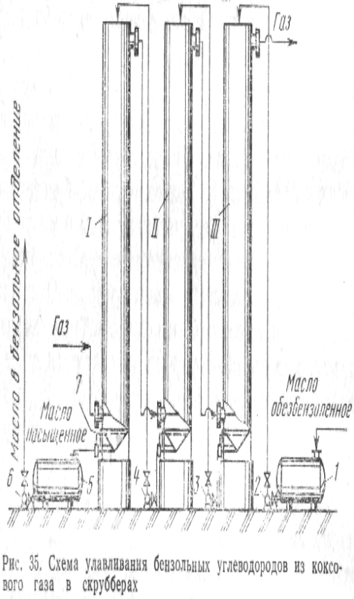 Вода з верхньої частини промывателя перетікає у відстійник 5, де остаточно, свобождается від незначної кількості уносимой нею смоли, і надходить на охолодження в градирню. Охолоджена вода знову надходить у холодильник, тобто знаходиться в замкнутому циклі. У воді після промывателя міститься незначна кількість нафталіну, що знижує витрати праці на очищення зрошувальних пристроїв градирні. Для розчинення наф талшта, що відкладається в газопроводі на ділянці від кінцевого холодильника до першого бензольного скрубера, газопровід періодично промивають гарячою поглинальною олією, що вводять у форсунку, розташовану на стояку виходу газу з кінцевого холодильника в газопровід.