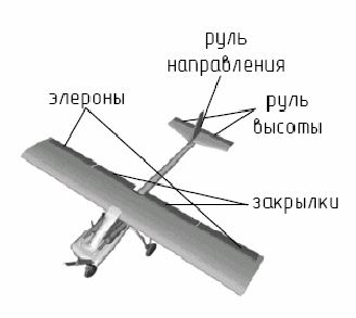К входам системы относятся управляющие органы летательного аппарата и возмущения окружающей среды. Рассматриваемый самолет обладает органом управления тягой двигателя и аэродинамическими рулями: элероны, закрылки, руль направления и высоты (рис. 1). Так же на самолет влияет скорость ветра, температура и плотность окружающего воздуха.
