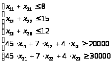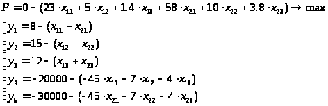 1. Составим математическую модель задачи. Возьмём в качестве целевой функции расходы на перелеты самолетов (соответственно, необходима минимизация целевой вункции), а в качестве переменных – число рейсов в день x>ij>, где первый индекс соответствует номеру города, а второй – типу самолета.