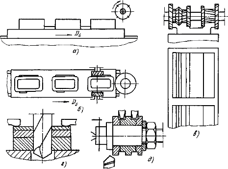 Параллельный способ обработки характеризуется одновременностью обработки поверхности заготовки многими инструментами. Поэтому основное технологическое время равно наибольшему времени обработки одной или нескольких поверхностей равноценных по затратам времени (рис.22.7 в-д):