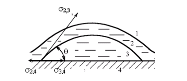 При рассмотрении условий равновесия системы "припой—основной металл" во флюсовой среде вместо σ>1,2> вводят σ>2,4> (межфазное натяжение на границе "флюс—основной металл"). При этом σ>2,4>< σ>1,2>, σ>3,4>< σ>1,3>, а уравнение для краевого угла имеет вид