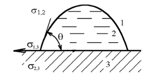 Работа сил адгезии W>а> связана с образованием межфазной границы с энергией σ> 2,3> вместо единичных поверхностей с энергиями σ> 1,2> и σ> 1,3>: