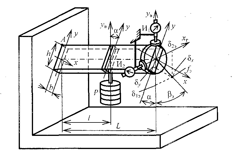 Постановка работы. В ряде случаев для экспериментальной оценки прочности и жесткости элементов конструкций может применяться метод, основанный на использовании механических приборов для измерения линейных и угловых перемещений (индикаторов часового типа (ИЧТ), проги-бомеров, сдвигомеров). Использование указанного метода рассмотрим на примере элемента конструкции в виде стальной (Е =2*105 МПа) балки (L = 0,5 м) прямоугольного (b=7 мм; h = 32 мм) сечения, нагруженной силой Р на расстоянии l=0,4 м под углом α=30° (рис. 1) и работающей в условиях косого изгиба. С этой целью для измерения вертикальной δ>1э >и горизонтальной δ>2э> составляющих максимального прогиба f>э> направленного под углом β>э>, установлены два ИЧТ И>1> и И>2>. Цена деления ИЧТ равна 0,01 мм. На установке проведено нагружение балки с регистрацией ступеней нагрузки Р и показаний δ>1э> и δ>2э> ИЧТ (табл. 1).