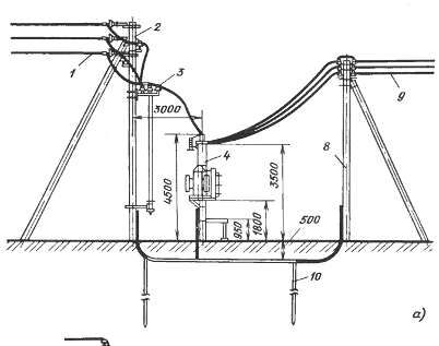 РУ 0,4 кВ содержат панельные и шкафные щиты с рубильниками, предохранителями, автоматическими выключателями и измерительными приборами. Простейшая распространенная конструкция установки комплектной трансформаторной подстанции КТП-10/0,4 кВ показана на рис. 1. Подстанция устанавливается на специальном металлическом или железобетонном основании в зависимости от конструкций. Рядом с ней устанавливаются концевые опоры воздушных линий, а в траншее монтируется заземляющее устройство, к которому присоединяются трансформатор подстанции, распределительные устройства 10 и 0,4 кВ, металлические элементы опор и разъединителей, а также нулевой провод электросети низкого напряжения. На рис. 1 указаны также общие габаритные размеры подстанций и другие размеры, необходимые для установки остальных элементов.