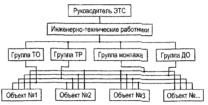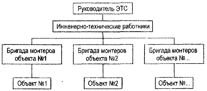 Территориальная структура ЭТС приведена на рис. 3. В ее основе лежит распределение исполнителей по объемам хозяйства (отделениям, бригадам, фермам). При этом выделенные группы исполнителей осуществляют все эксплуатационные работы, но только на своих участках.
