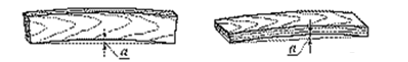 Деформации – при этом также говорят о покоробленной или перекошенной древесине – это простое или многократное искривление сортимента в продольном направлении. Узкая сторона пиломатериала может иметь продольную деформацию, доска и брусок могут быть искривлены по ширине, то есть быть выпуклыми или вогнутыми. Пиломатериал в продольном направлении может быть изогнут спирально или в форме пропеллера. Покоробленности вызываются большим количеством причин, например: неравномерная усушка, напряжения усушки, дефекты штабелирования и косослойность. В частности, продольная покоробленность возникает из-за различий в усушке по длине волокон. Например, в одном сортименте оказываются участки разной по строению древесины, молодая древесина у сердцевины, имеющая большую усушку, чем нормальная древесина (рисунок 1)