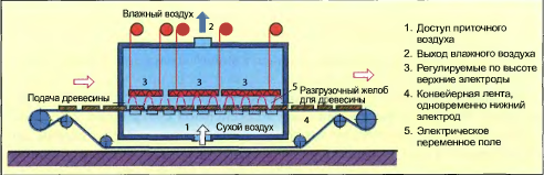 При высокочастотной сушке древесина подается на конвейере в область действия высокочастотного переменного электрического поля, мощность которого можно менять для достижения различных степеней высушивания древесины (рисунок 6). Достоинство такой сушки заключается в том, что древесина достаточно быстро нагревается изнутри. Это способствует высушиванию, таким образом, требуется значительно более короткое время, чем при других методах сушки, даже для большого поперечного сечения. Время сушки лежит в пределах нескольких минут. Древесина типа дуба и бука при высокочастотной сушке имеет тенденцию к изменению окраски.