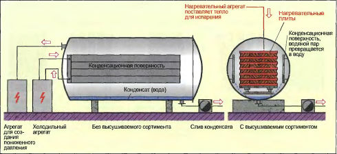 В установках с нагревательными плитами между отдельными слоями прокладываются плиты, которые через систему шлангов соединены с системой нагрева (рисунок 7). После установки высушиваемого сортимента в сушильную камеру происходит нагрев воздуха, и давление воздуха снижается. Приток тепла происходит постоянно. Испаряющаяся из древесины влага охлаждается на встроенных поверхностях охлаждения, конденсируется и отводится. Незадолго до достижения желаемой конечной влажности нагрев выключают. Затем камера проветривается и открывается.