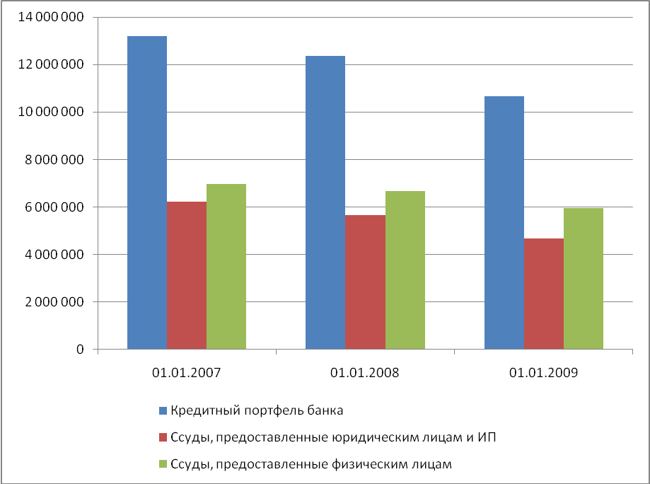 Анализ кредитного портфеля Городского отделения № 2363 Сбербанка России (ОАО) показал, что кредитный портфель отделения почти в равных долях состоит из ссудной задолженности юридических и физических лиц, с небольшим перевесом в сторону задолженности физических лиц. В течение анализируемого периода 2007-2009 г.г. произошло существенное уменьшение кредитного портфеля по ссудам, предоставленным как юридическим лицам, так и физическим лицам. Темп снижения в целом кредитного портфеля за анализируемый период составил 19 %. В то же время отмечается существенный рост просроченной задолженности, т.е. снижается качество кредитного портфеля. Так, при уменьшении ссудной задолженности в 0,8 раза, просроченная задолженность увеличилась в 3,7 раза.