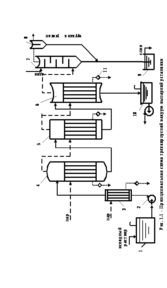 Принципиальная технологическая схема трехкорпусной вакуум-выпарной установки непрерывного действия представлена на рис.1.1.