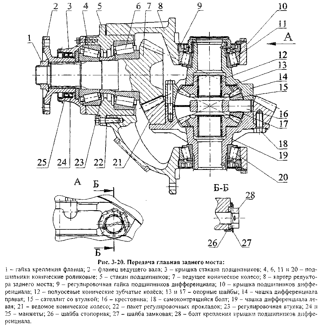Центральная главная передача заднего моста (рис.3-20) одноступенчатая, состоит из пары конических зубчатых колес со спиральными зубьями, межколёсного дифференциала и картера редуктора заднего моста.
