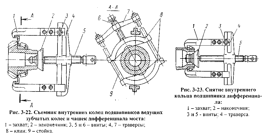 Для этого захваты 1 (рис.3-22) завести за внутреннее кольцо подшипника и зафиксировать винтами 3. Упираясь наконечником 2 в торец дифференциала, ввертывать винт 5 в траверсу 4 до полного снятия внутреннего кольца подшипника.