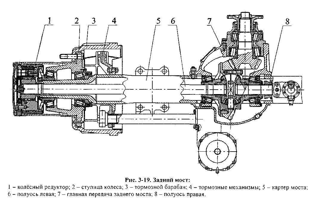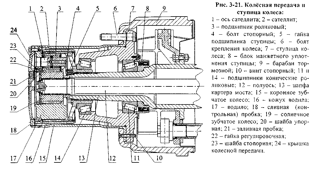 Колёсная передача содержит солнечное зубчатое колесо 19, которое связано с главной передачей при помощи полуоси 12, пять сателлитов 2, установленных на осях 1 с роликовыми подшипниками, расположенных в водиле 17, и коронное зубчатое колесо 15, соединённое неподвижно с цапфой 13 картера моста. Оси 1 сателлитов запрессованы в соосные отверстия в водиле 3 7 колёсной передачи. Водило 17 имеет приваренный кожух 16, соединённый со ступицей 7 колеса, упорную шайбу 20 и гайку 22 для регулировки температурного зазора между трущимися поверхностями. В крышке 23 колёсной передачи имеются сливная 18 и заливная 21 пробки.