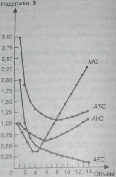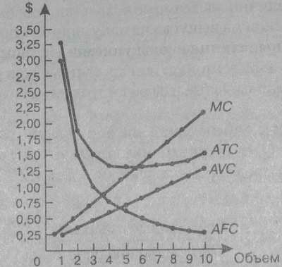 AVC сначала падают, достигают своего минимума, а затем начинают расти (не отражено в таблице 2). Такой наклон кривой объясняется законом убывающей доходности т.е. до четвертой единицы предельные издержки падают, следовательно и AVC так же будут падать, а начиная с пятой единицы как TVC так и AVC начинают возрастать.