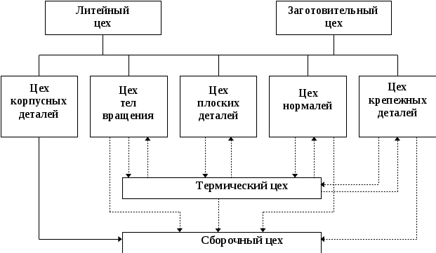 Все многообразие производственных структур машиностроительных предприятий в зависимости от их специализации можно свести к следующим типам: заводы с полным технологическим циклом, располагающие всей совокупностью заготовительных, обрабатывающих и сборочных цехов; заводы механосборочного типа (с неполным технологическим циклом), располагающие ограниченным количеством основных цехов и, как правило, получающие необходимые заготовки в порядке кооперирования со стороны; заводы сборочного типа, выпускающие готовые изделия из деталей и комплектующих, изготовляемых на других предприятиях; заводы, специализированные на производстве заготовок, как правило, построенные на принципах технологической специализации; заводы подетальной специализации, производящие отдельные детали, блоки, узлы, подузлы, сборочные единицы.
