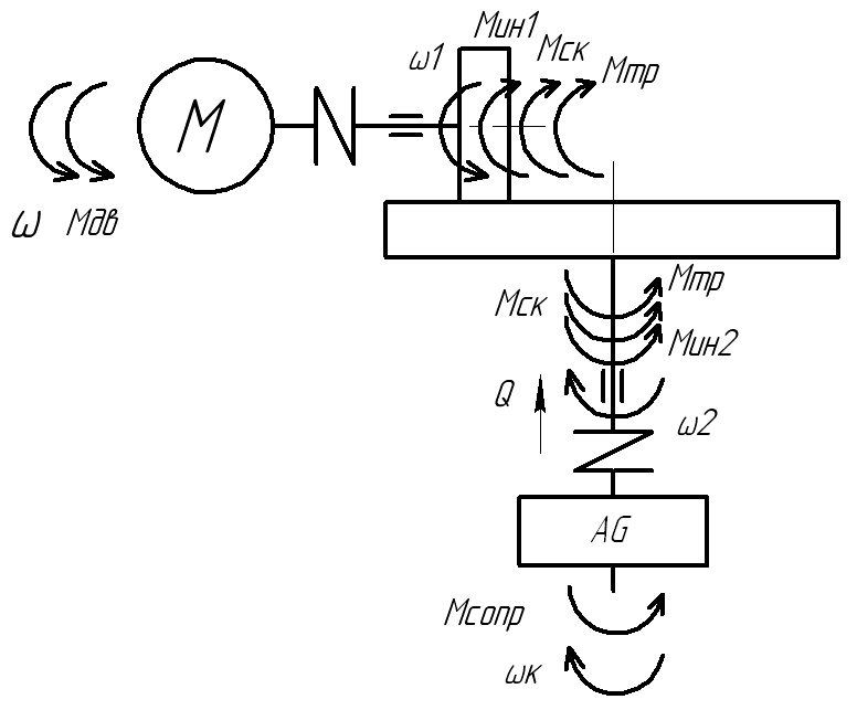 Рассматриваемая система состоит из электродвигателя, который создает момент двигателя М>n>, муфты, ведущего колеса, ведомого диска, подшипников качения и рабочего органа. Двигатель создает крутящий момент с угловой скоростью ω, который передается через муфту на ведущее колесо, с него на ведомый диск, затем на рабочий орган (рис. 3.1). Винтовое прижимное устройство обеспечивает передачу крутящего момента.