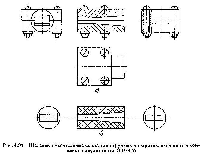 На рис. 4.32 показан струйный аппарат, который формирует струю с равномерным по ширине профилем скорости за счет перекрытия расположенных в ряд с определенным шагом струй круглого сечения. Аппарат используется для обработки сложнопрофильных поверхностей, причем его конструкция позволяет в широких пределах регулировать
