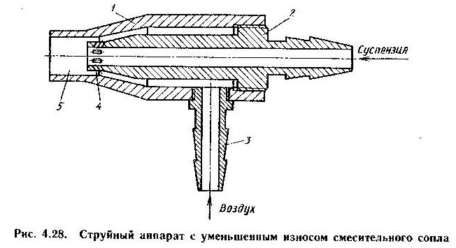 Одним из существенных недостатков в работе струйного аппарата является абразивный износ рабочей части смесительного сопла. Для уменьшения этого недостатка используется струйный аппарат, конструкция которого представлена на рис. 4.28. Аппарат состоит из корпуса 1, втулки 2 для подачи суспензии, срез выходного отверстия которой расположен на 1/3 длины рабочей части смесительного сопла 5, и штуцера 3 для подвода сжатого воздуха. Во втулке 2 выполнены отверстия 4, которые равномерно расположены под острым углом к оси втулки по направлению движения абразивных частиц в непосредственной близости от среза выходного отверстии втулки.