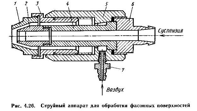 Для обработки фасонных и плоских поверхностей применяют струйный аппарат, конструкция которого представлена на рис. 4.26. Аппарат состоит из корпуса 5, в который вставлен ствол 4 со сменным активным соплом 2. В корпус с передней стороны ввернут стакан 3 со сменным смесительным соплом / С другой стороны корпуса через штуцер в в аппарат подается суспензия, а через штуцер 7 - сжатый воздух. Сжатый воздух, проходя между конусами активного и смесительного сопел, эжектирует суспензию и выбрасывает ее на обрабатываемую поверхность.