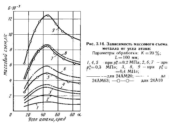 Результаты расчетов, выполненных по этой формуле, достаточно хорошо совпадают с экспериментальными данными. Однако эта формула не учитывает влияния па массовый съем металла таких параметров, как размеры абразивных частиц, углы атаки частиц, давление воздуха, длина струи и другие.