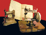 Справа - дитяча швацька машина ланцюгового стібка з дерев'яною підставою і литим фігурним корпусом, прикрашеним багатоколірним розписом (Подільський механічний завод, 1935-1940). Зліва - дитяча швацька машина ланцюгового стібка з литим художнім корпусом (Західна Європа, 1910-1930); махове колесо замінене спеціальною ручкою.