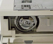 Позиція 4. Коли петля верхньої нитки обійде довкола шпульки більш ніж на 180 градусів, важіль нітепрітягивателя швидко піднімається вгору і затягує стібок. Човник починає рухатися проти годинникової стрілки.
