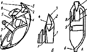 Човник (машини “Подольськ” 142 кл, “Чайка”): А - права сторона; Б - ліва сторона; 1 - права кромка широкої полиці; 2 - права внутрішня кромка носика; 3 - права зовнішня кромка; 4 - ліва внутрішня кромка; 5 - внутрішня кромка широкої полиці; 6 - лівий внутрішній кут хвостовика; 7 - широка полиця; 8 - вузька полиця |