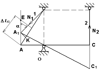 Составляем расчетную схему. С учетом удлинения стержня 2 точка А должна совпасть с точкой Е, если бы не было стержня 1. Сопротивление первого стержня приводит к тому, что точка А занимает положение А>1>. В связи с этим, в стержнях появляются внутренние усилия N>1> и N>2>. Составим уравнение статики: