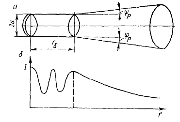 Направленность УЗК- При излучении пьезоэлемеитом (рис. 2.5, а) импульса УЗК в среде возникает УЗ-поле, которое имеет вполне определенные пространственные границы. Угол расхождения фр зависит от соотношения длины волны и диаметра излучателя 2а: