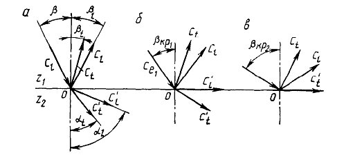 Рис. 4 Отражение и преломление продольной волны на границе раздела двух твердых сред.