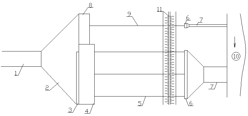 1 – водоподводящий канал; 2 – аванкамера; 3 – водоприемные сооружения; 4 – здание насосной станции; 5 – напорные трубопроводы; 6 – водовыпуски; 7 – водоотводящие каналы; 8 – труба-регулятор; 9 – трубопровод для самотечного сброса воды; 10 – водоприемник; 11 – ограждающая дамба.