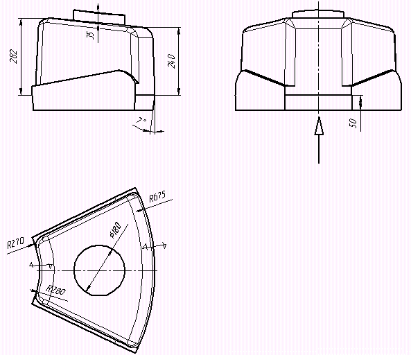 4) Так как будущая отливка будет изготавливаться из стали 30Л, то её конструкция должна обеспечивать направленное последовательное затвердевание снизу вверх. Конструкция данной детали позволяет создать направленное затвердевание, так как есть возможность расположить отливку таким образом, чтобы тонкие части располагались внизу, а более массивные вверху под прибылью, следовательно, по данному критерию отливка технологична.
