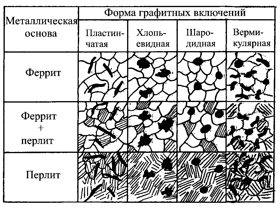 Рис. 3. Классификация чугунов по структуре металлической основы и в форме графитовых включений