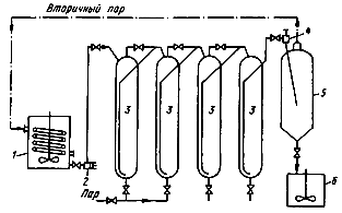 Пульпа из автоклавов поступает в самоиспаритель—аппарат, находящийся под более низким абсолютным давлением, чем автоклавы (примерно 0,15—0,25 МПа), в котором происходит интенсивное испарение и вследствие этого быстрое охлаждение пульпы. Образующийся вторичный пар используют для подогрева автоквлавной пульпы рис 2[1].