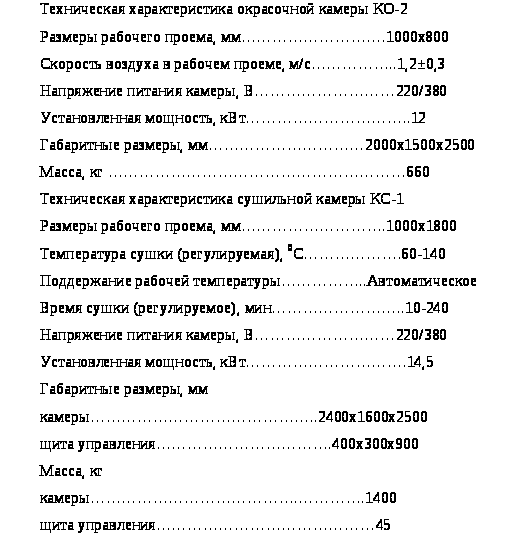 Комплект окрасочного оборудования. Комплекс предназначен для окраски и последующей сушки изделий бытовой техники па предприятиях бытового обслуживания населения. В состав комплекса входят окрасочная камера КО-2 и окрасочная камера КО-2 с вертикальным нижним отсосом воздуха и мокрым способом очистки воздуха от краски с применением вихревой системы воздухопромывания. Окраска изделии производится методом пневматического распыления с помощью ручного краскораспылителя Лакокрасочные материалы глифталевые, пентафталевые, алкидно-стирольные, мочевино- и меламиноформальдегидные, эпоксидные, фенольные. Сушильная камера КС-1 тупиковая, конвекционная с электрически подогревом воздуха.